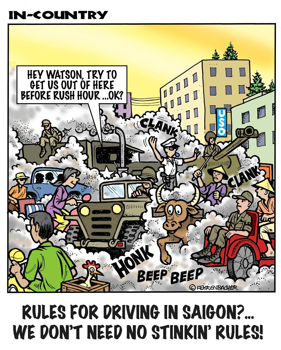 Phil enlisted in the Army in 1965 where you served for years in Vietnam.  He became a graphic designer and has worked for the state of Oregon for 26 years.  He retired in 2003 and started the Cartoon "In-Country".  The cartoons reflect his experiences during his tour of duty in South Vietnam.